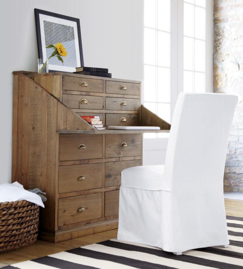 It's made of reclaimed pine with brushed brass bin pulls on its twelve drawers. The best part is it's multi-tasking ability. The top actually folds down to create a sturdy desk surface.